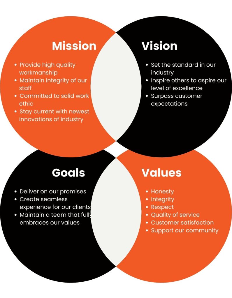 Our vision is to set the standard in our industry, inspiring others to aspire to our level of excellence. We will achieve this by consistently delivering on our promises, surpassing customer expectations, and embracing a culture of continuous improvement. Our goal is to create a seamless experience for our clients, from initial contact to project completion, driven by a team that fully embraces our values and commitment to excellence.